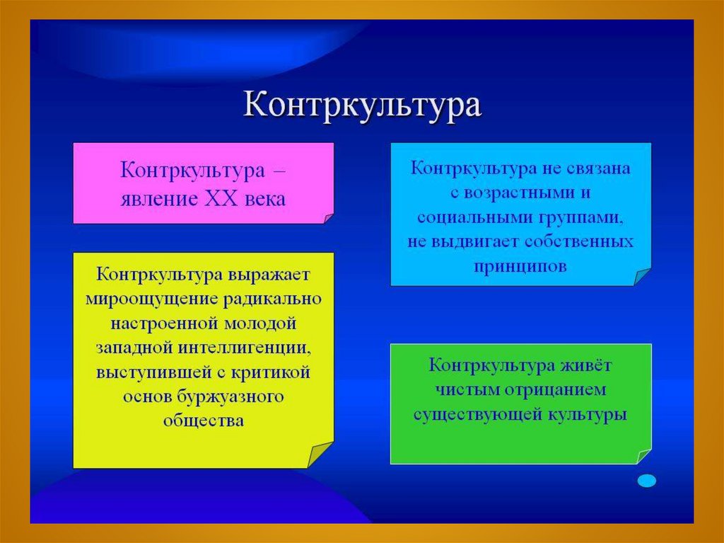 • Контркультура обозначает такуюсубкультуру, которая не просто отличается