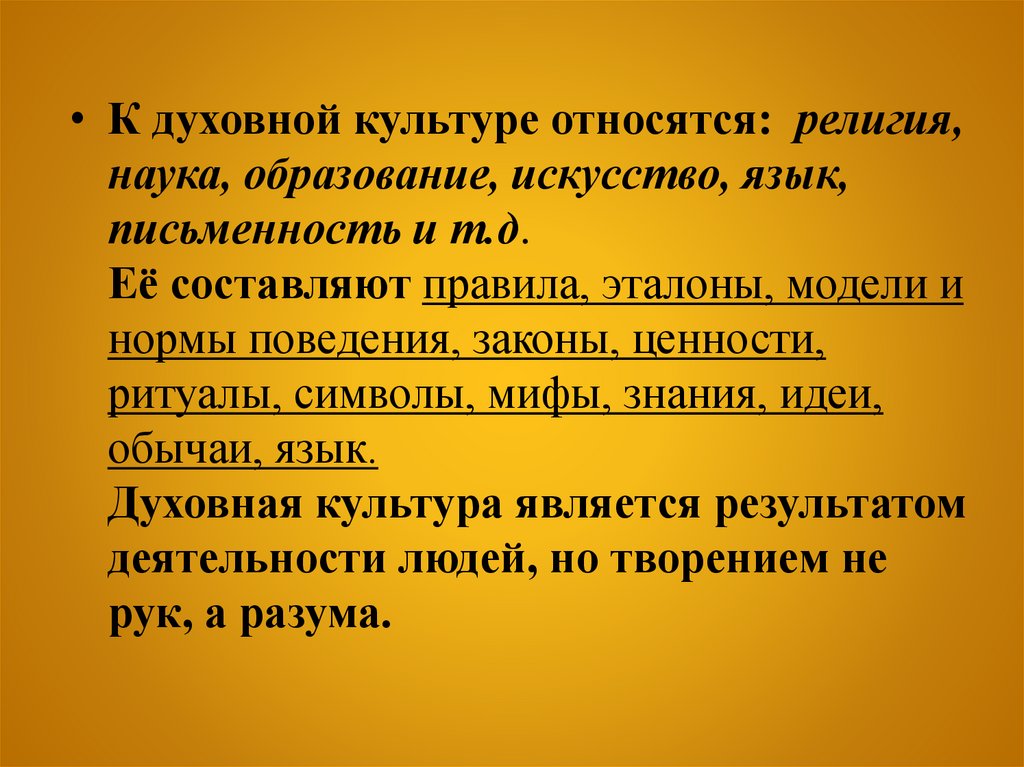 • К духовной культуре относятся: религия,наука, образование, искусство, язык,