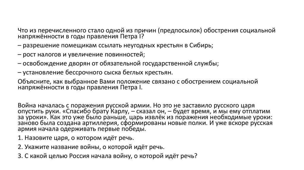 Что из перечисленного стало одной из причин (предпосылок) обострения социальнойнапряжённости в годы правления Петра I?