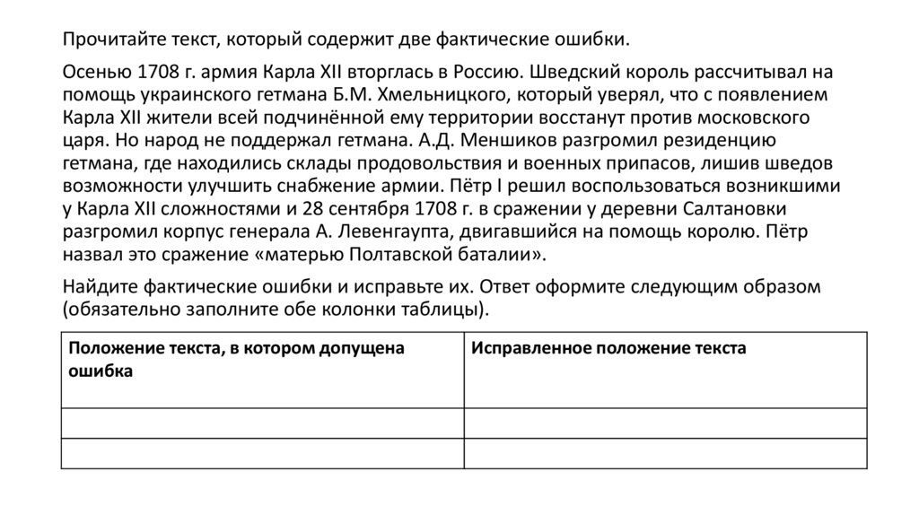 Прочитайте текст, который содержит две фактические ошибки.Осенью 1708 г. армия Карла XII вторглась в Россию. Шведский король рассчитывал на