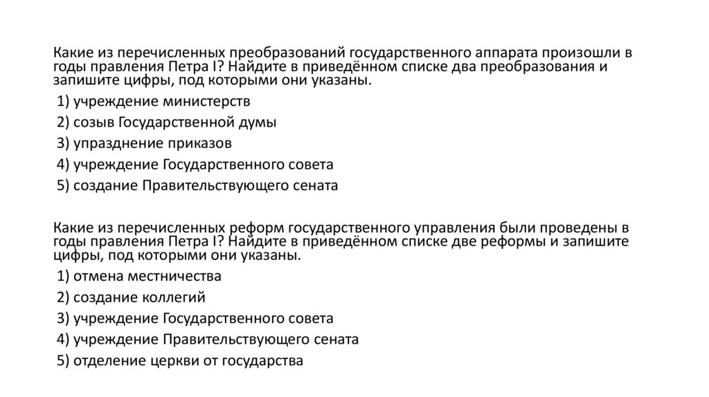 Какие из перечисленных преобразований государственного аппарата произошли вгоды правления Петра I? Найдите в приведённом списке два преобразования и