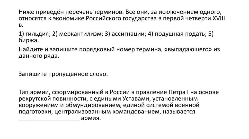 1) гильдия; 2) меркантилизм; 3) ассигнации; 4) подушная подать; 5)
