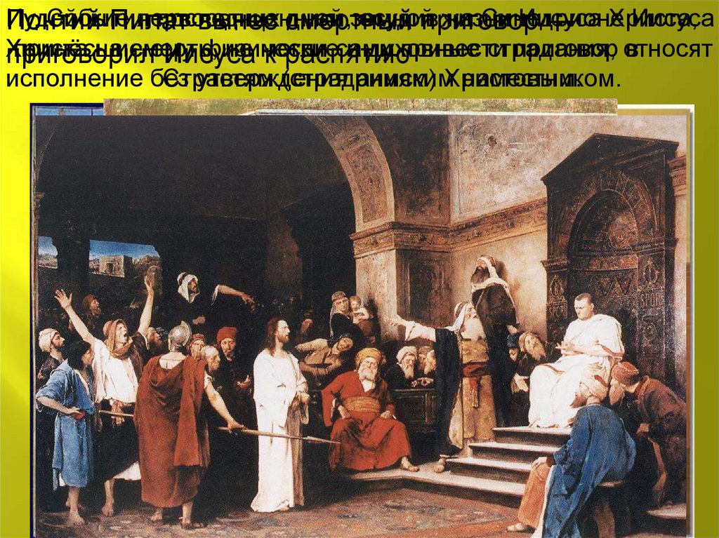 По приговору Понтия Пилата Иисусбыл распят на Голгофе, куда он, согласно