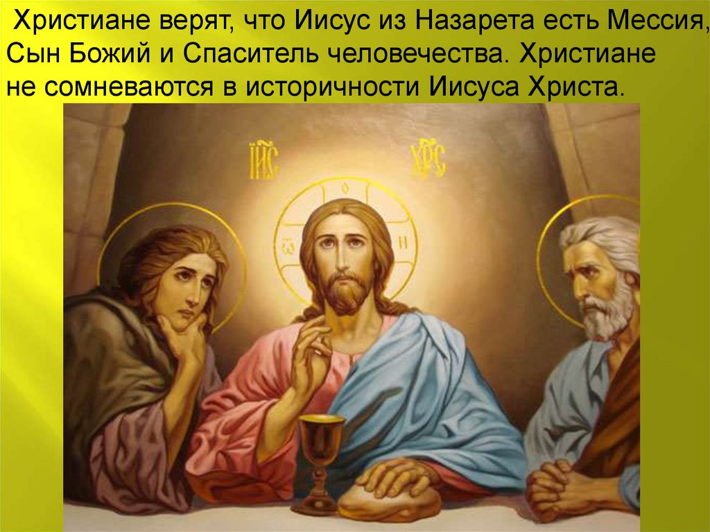 Христиане верят, что Иисус из Назарета есть Мессия,Сын Божий и Спаситель человечества. Христиане