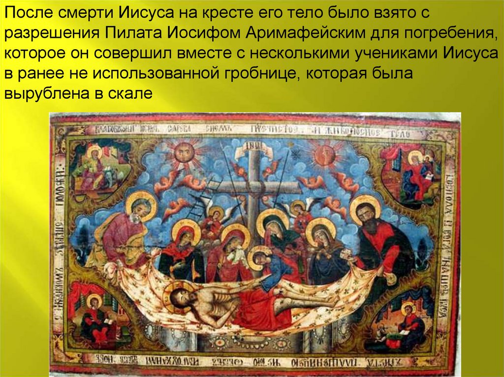 После смерти Иисуса на кресте его тело было взято сразрешения Пилата Иосифом Аримафейским для погребения,