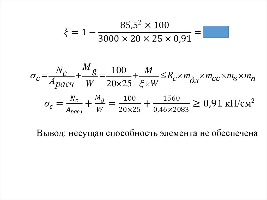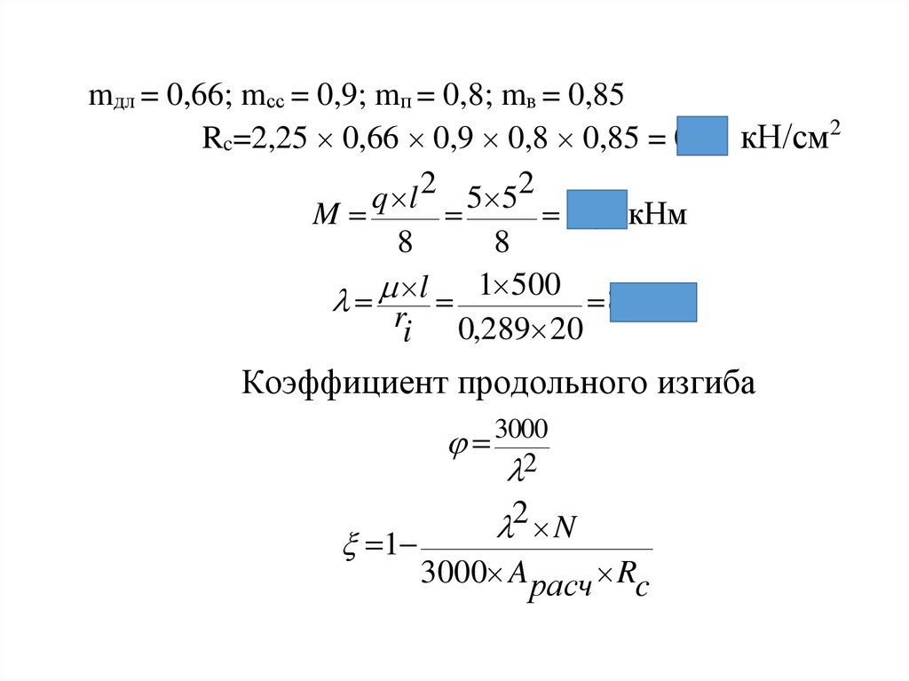mдл = 0,66; mсс = 0,9; mп = 0,8; mв = 0,85Rc=2,25 0,66 0,9 0,8 0,85 = 0,91 кН/см2