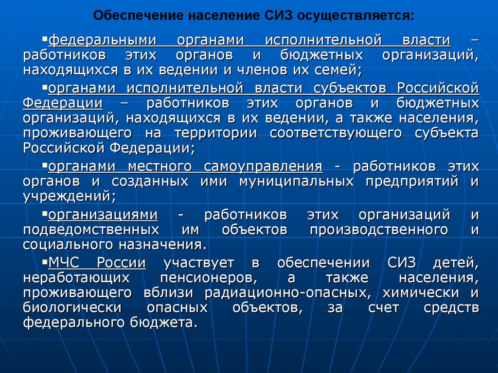 Обеспечение население СИЗ осуществляется:федеральными органами исполнительной власти –