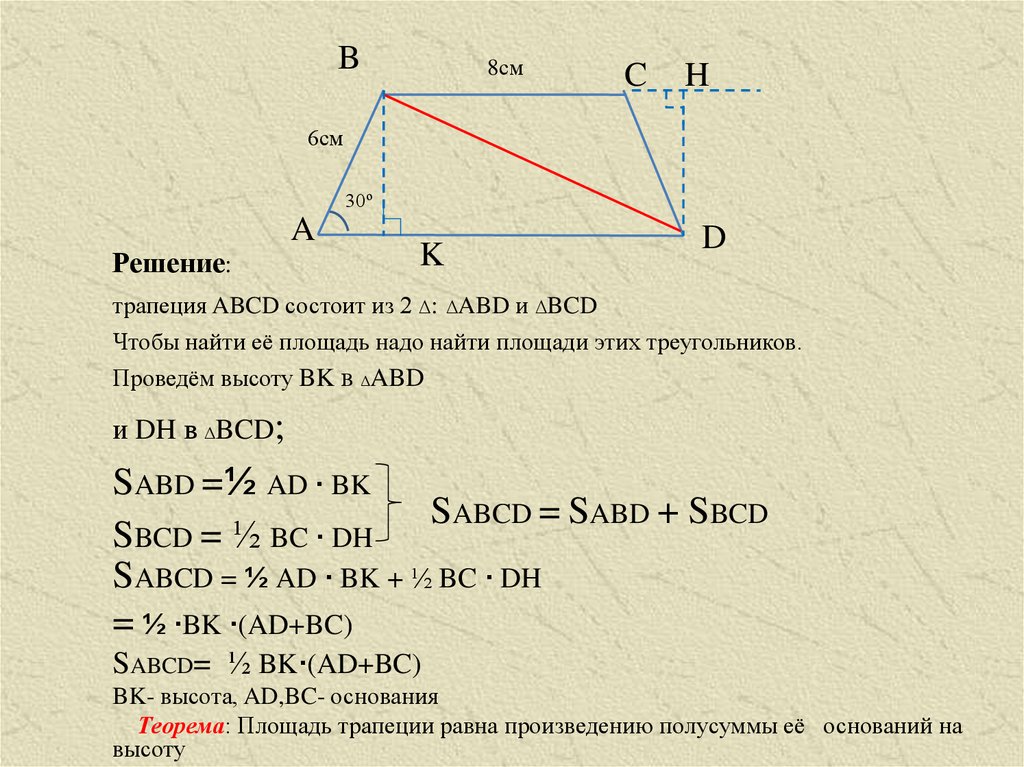 трапеция ABCD состоит из 2 Δ: ΔABD и ΔBCD