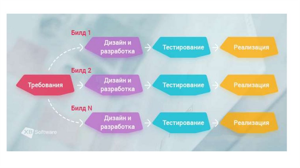 17. В этой модели возможна одновременная разработка разных версий продукта. Например, первая версия может проходить этап