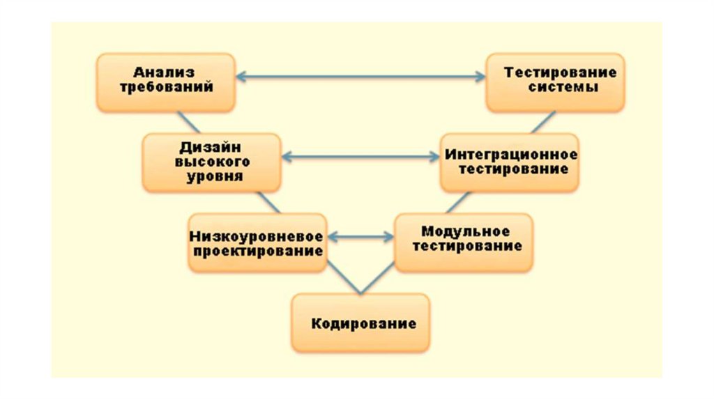 9. V-модель — это более совершенная и тестировочно-ориентированная версия водопада. Она наглядно показывает, что тестирование