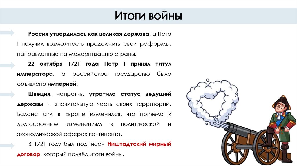 Россия утвердилась как великая держава, а ПетрI получил возможность продолжить свои реформы,