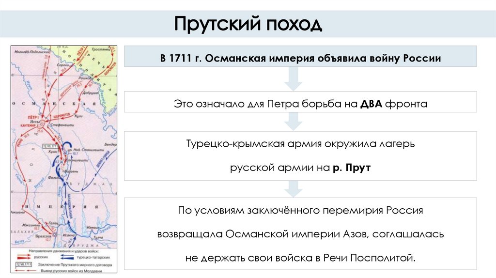 В 1711 г. Османская империя объявила войну РоссииЭто означало для Петра борьба на ДВА фронта