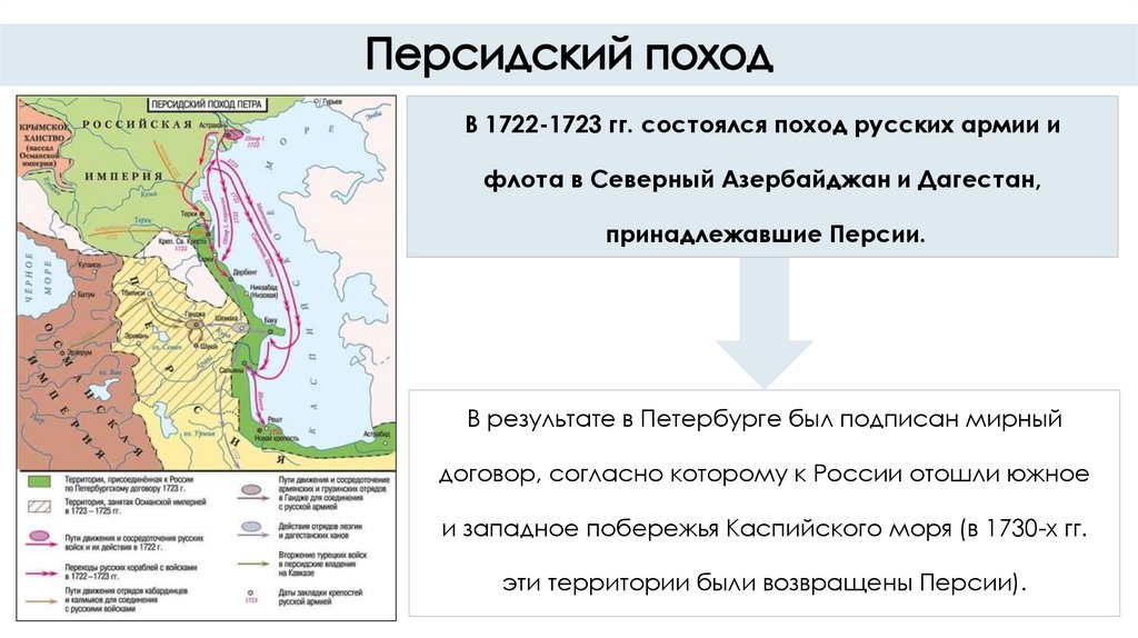 В 1722-1723 гг. состоялся поход русских армии ифлота в Северный Азербайджан и Дагестан,