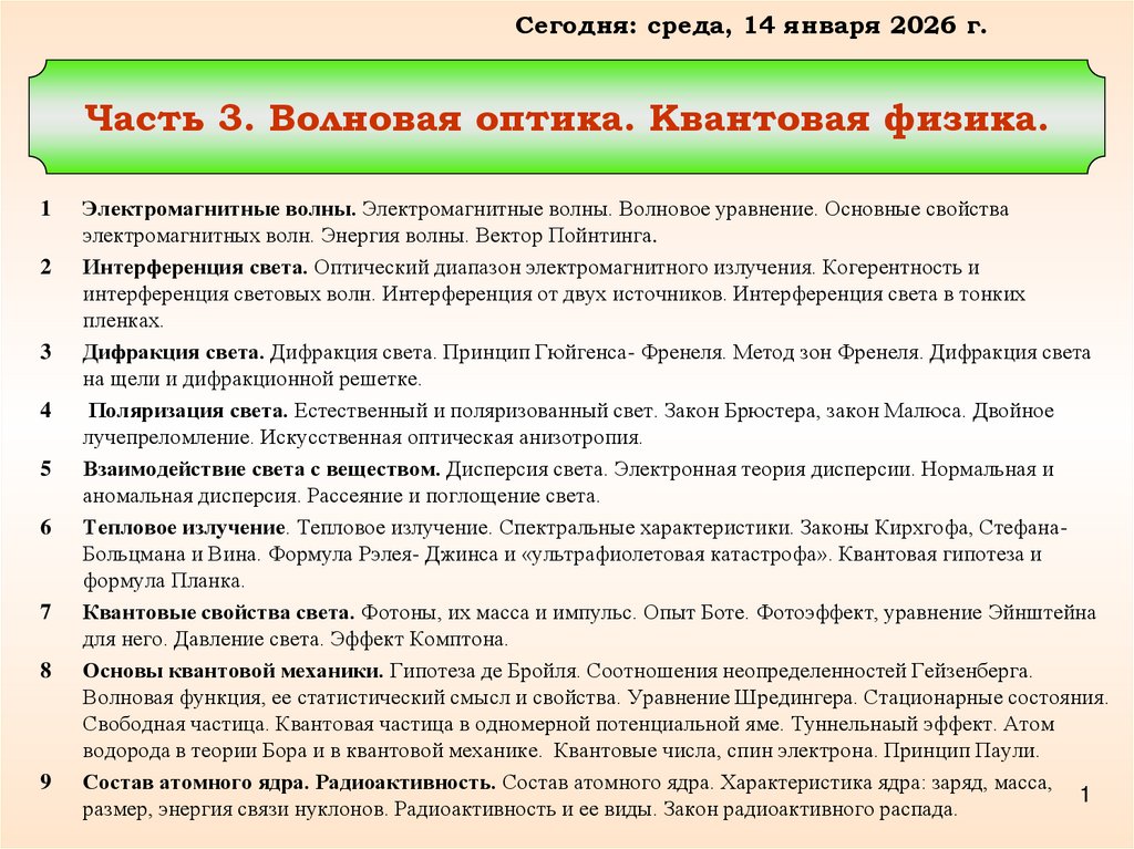Сегодня: среда, 14 января 2026 г.Часть 3. Волновая оптика. Квантовая физика.