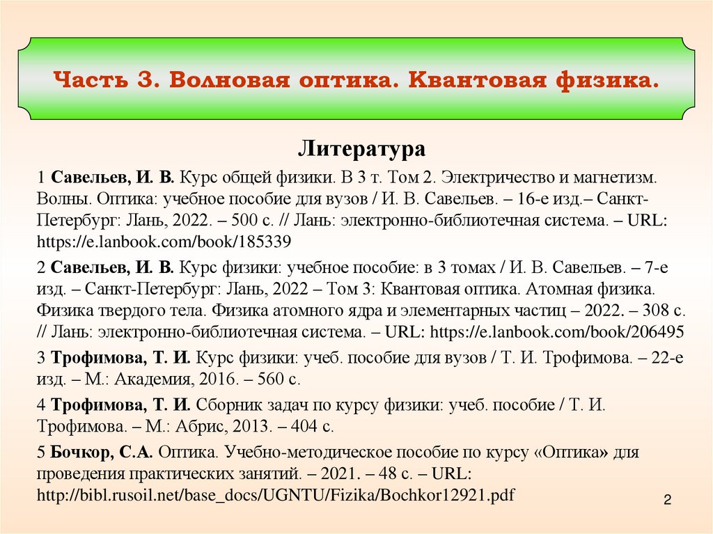 Волны. Оптика: учебное пособие для вузов / И. В. Савельев. – 16-е изд.– СанктПетербург: Лань, 2022. – 500 с. // Лань: электронно-библиотечная система. – URL:
