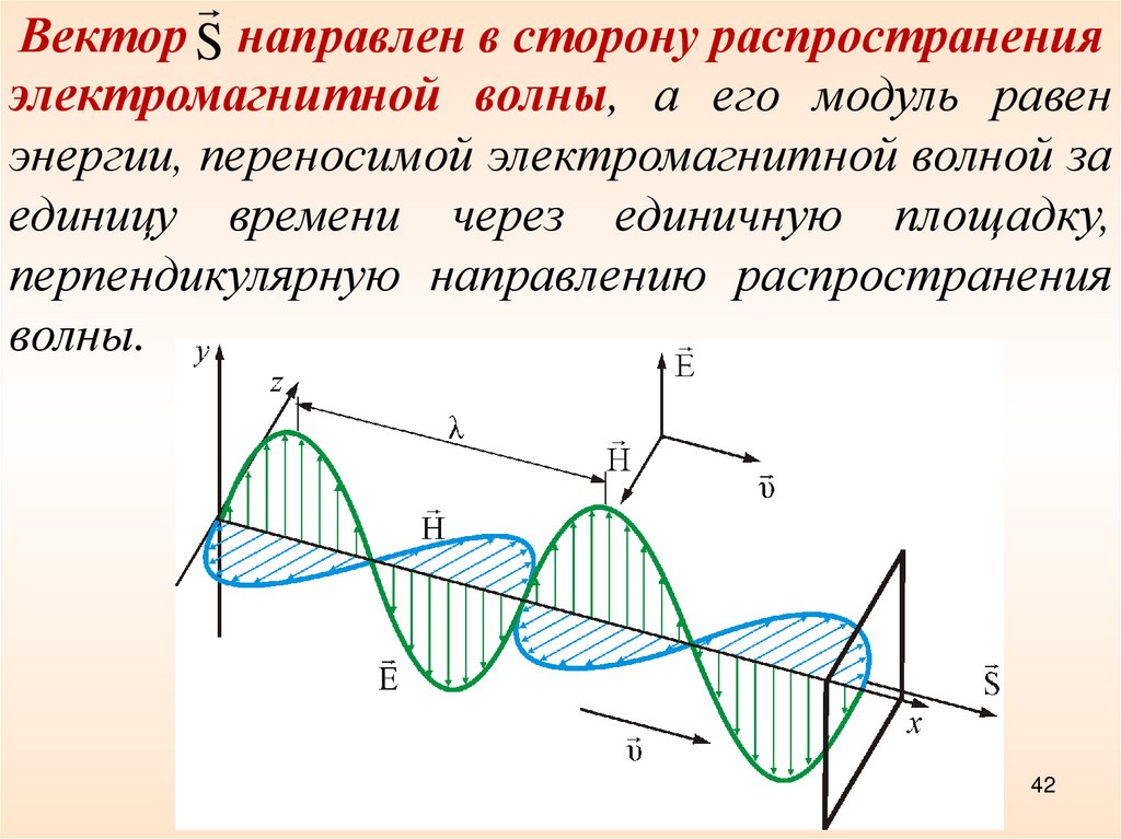 Вектор S направлен в сторону распространенияэлектромагнитной волны, а его модуль равен
