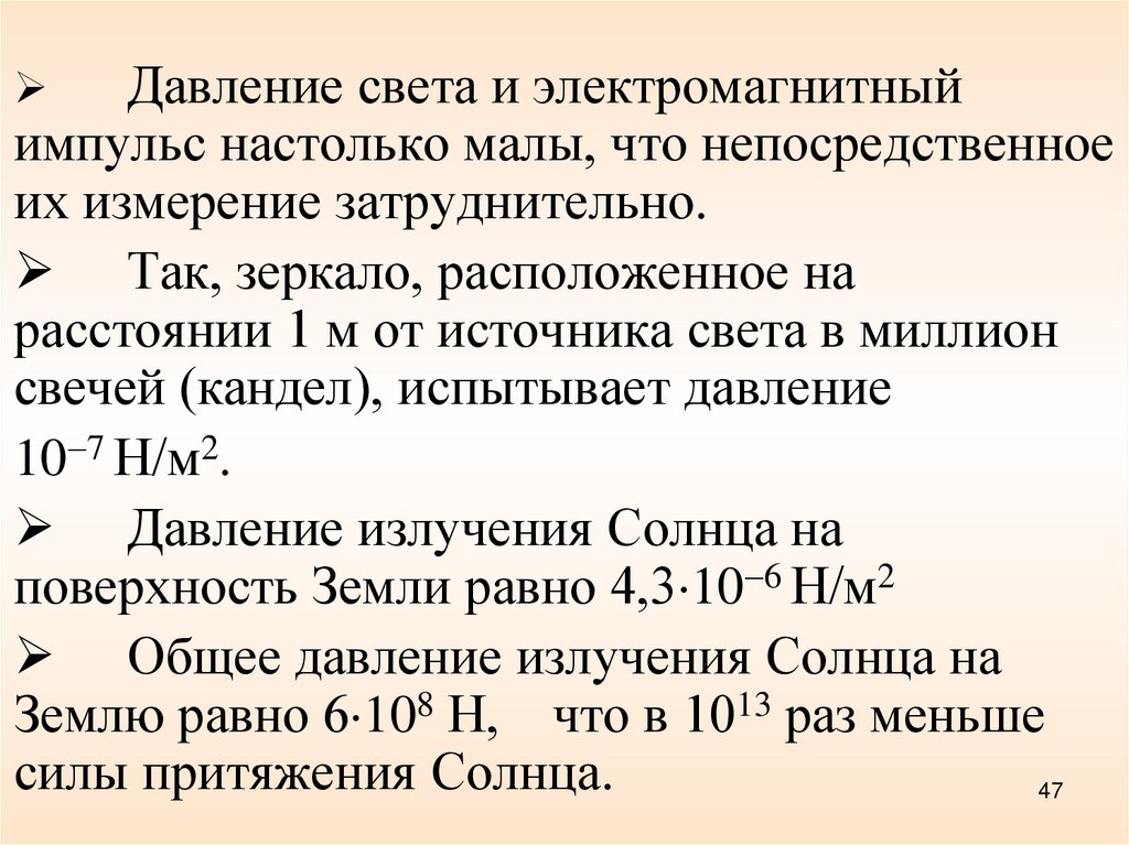 Давление света и электромагнитныйимпульс настолько малы, что непосредственное
