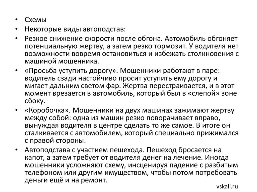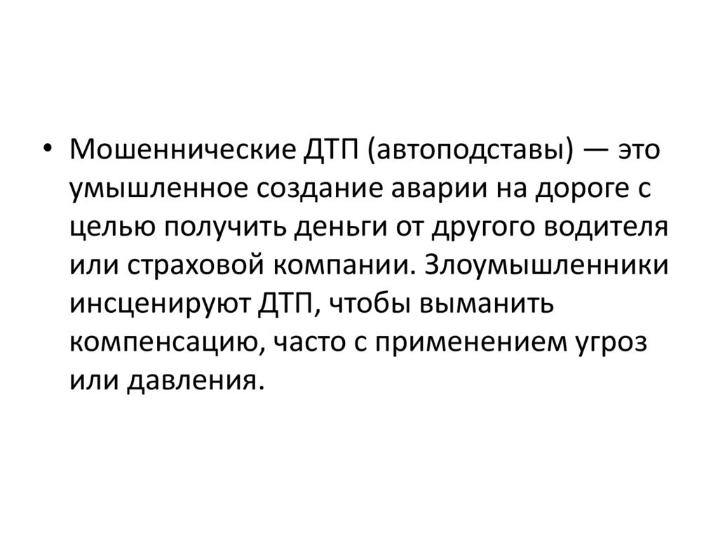 • Мошеннические ДТП (автоподставы) — этоумышленное создание аварии на дороге с