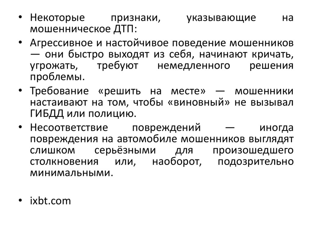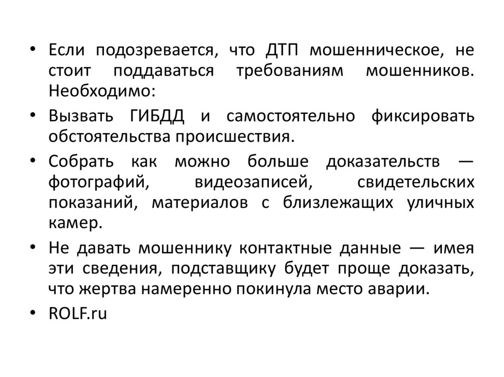 • Если подозревается, что ДТП мошенническое, нестоит поддаваться требованиям мошенников.
