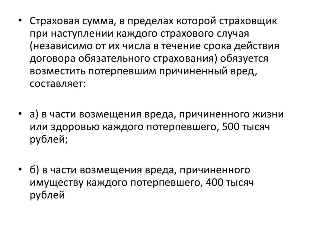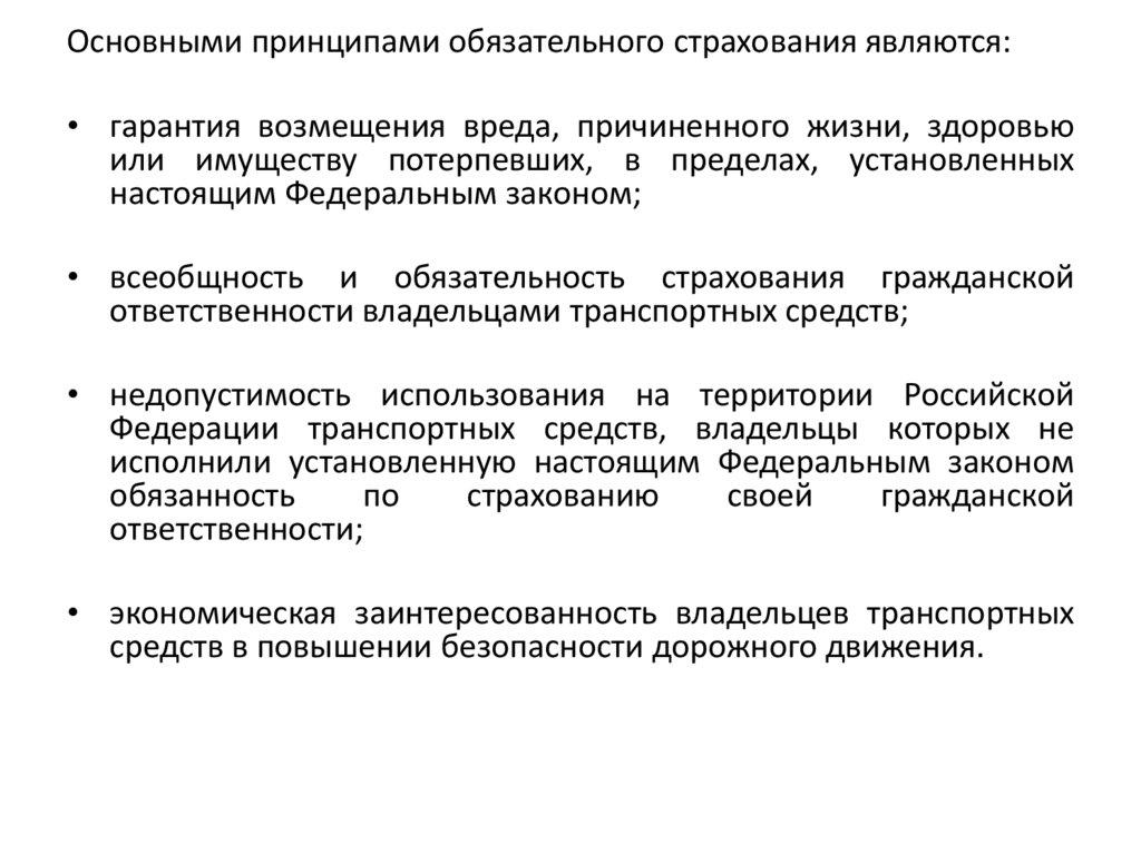 Основными принципами обязательного страхования являются:• гарантия возмещения вреда, причиненного жизни, здоровью