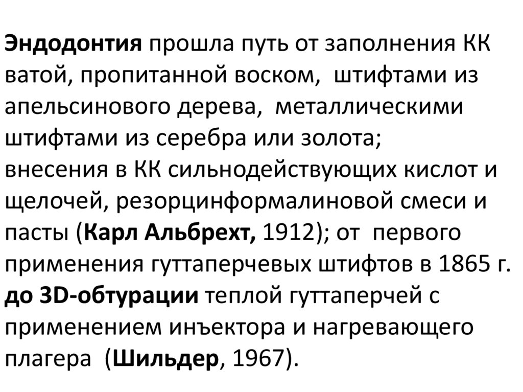 Эндодонтия прошла путь от заполнения ККватой, пропитанной воском, штифтами из