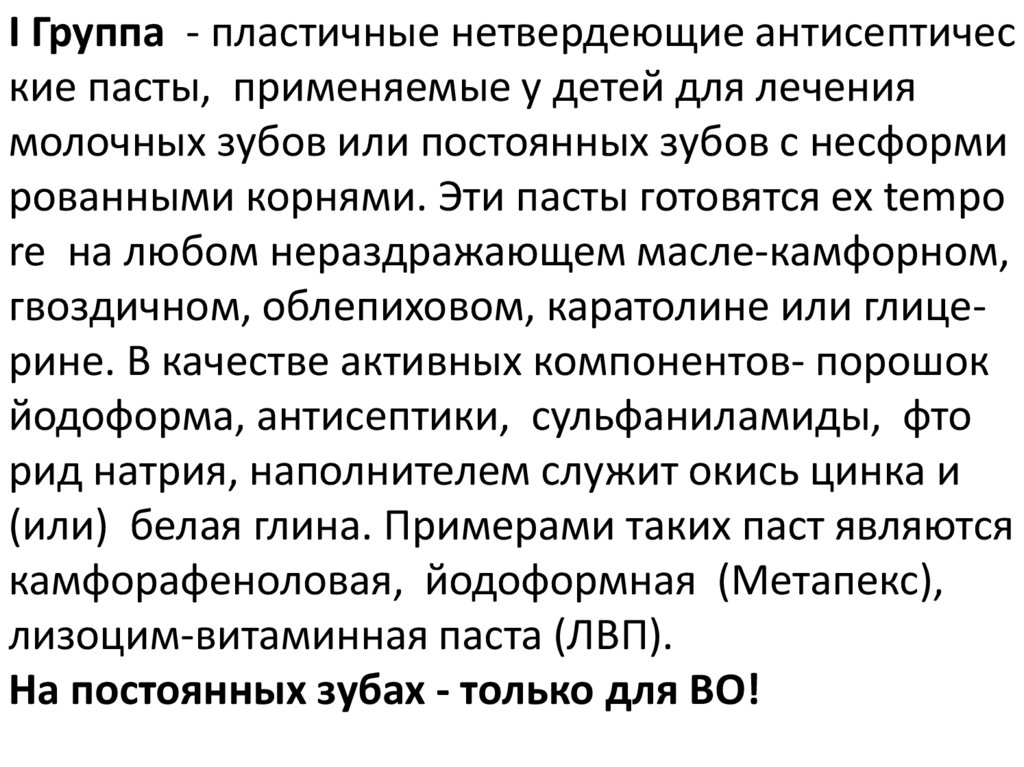 I Группа - пластичные нетвердеющие антисептические пасты, применяемые у детей для лечения