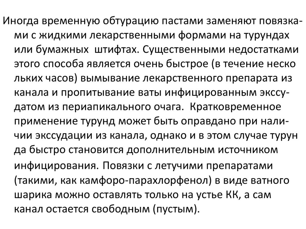 Иногда временную обтурацию пастами заменяют повязками с жидкими лекарственными формами на турундахили бумажных штифтах. Существенными недостатками