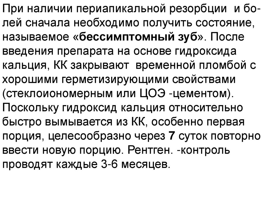 При наличии периапикальной резорбции и болей сначала необходимо получить состояние,называемое «бессимптомный зуб». После