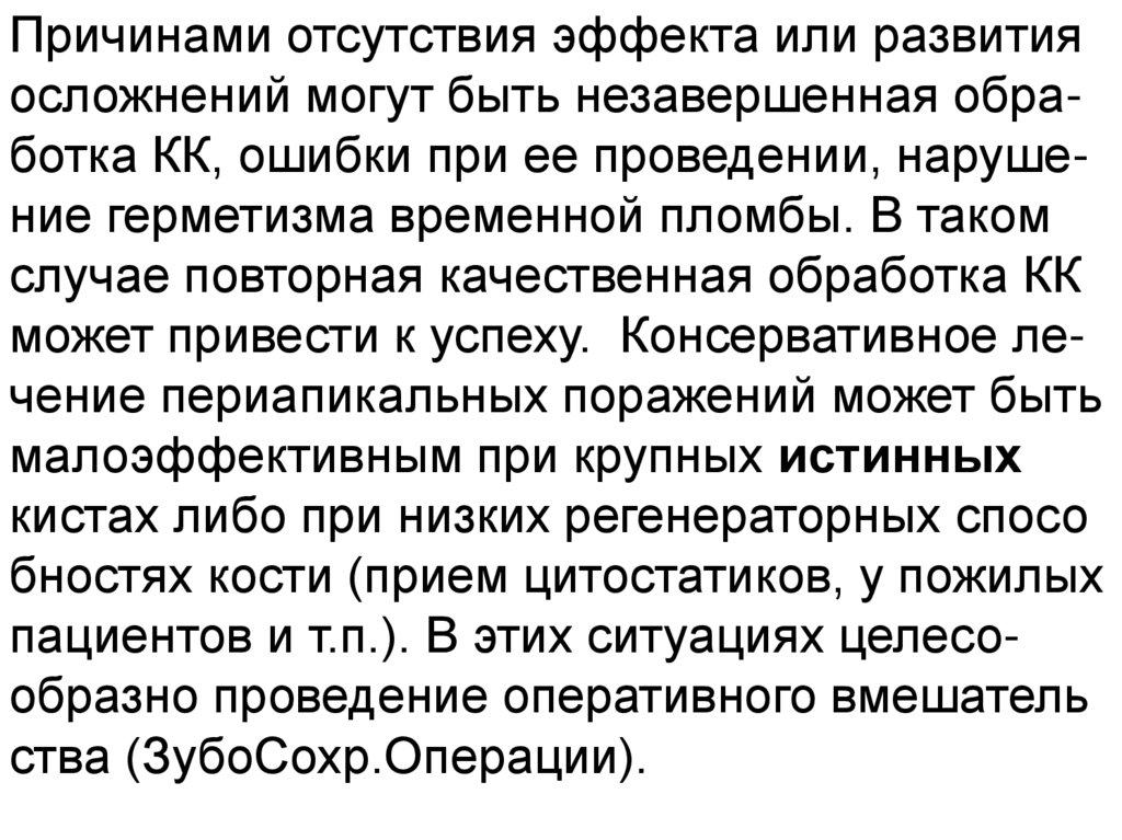 Причинами отсутствия эффекта или развитияосложнений могут быть незавершенная обработка КК, ошибки при ее проведении, нарушение герметизма временной пломбы. В таком