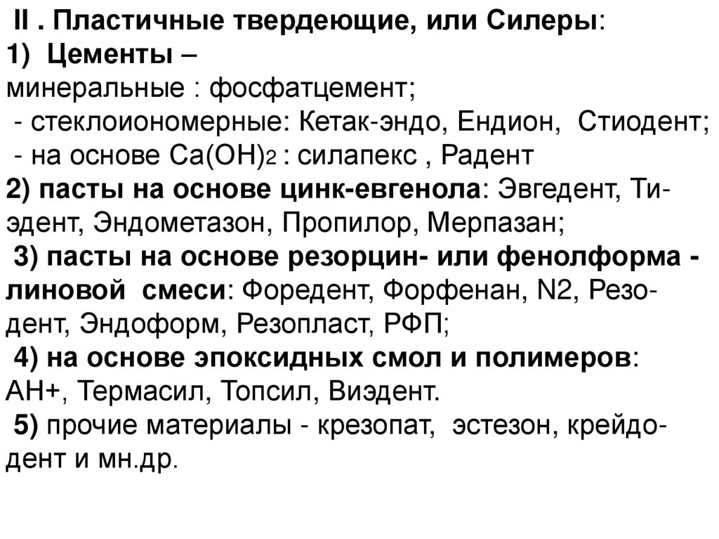II . Пластичные твердеющие, или Силеры:1) Цементы –