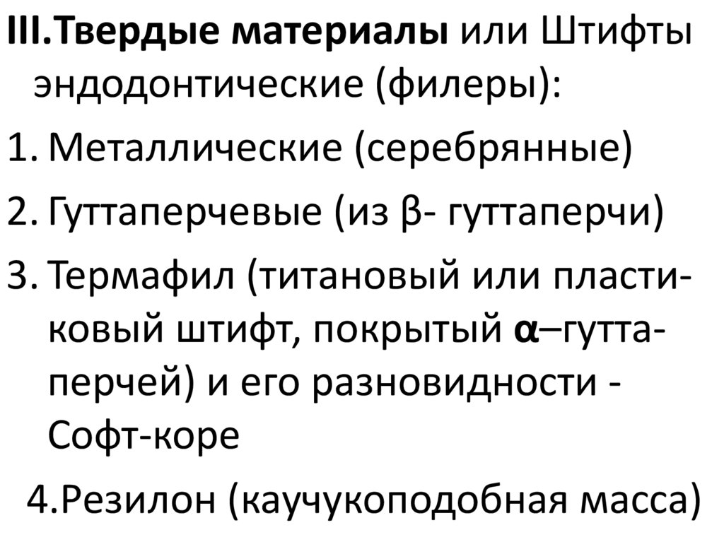 III.Твердые материалы или Штифтыэндодонтические (филеры):