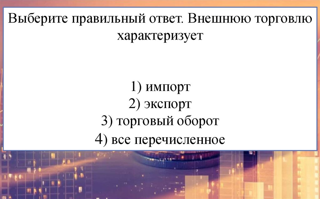 Выберите правильный ответ. Внешнюю торговлюхарактеризует