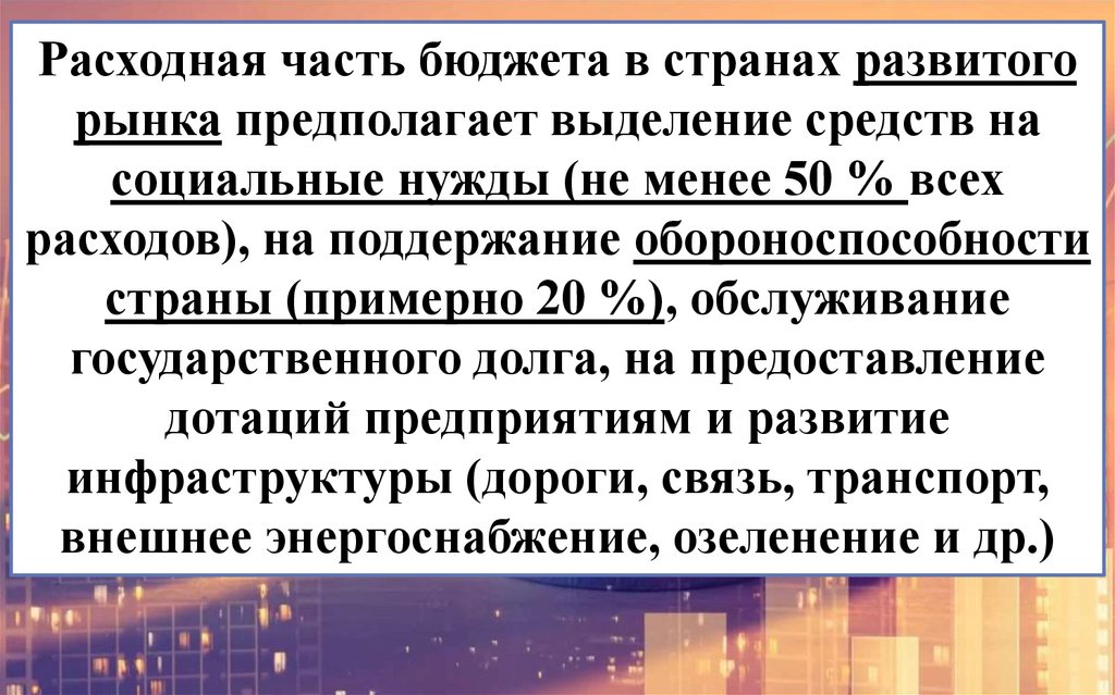Расходная часть бюджета в странах развитогорынка предполагает выделение средств на
