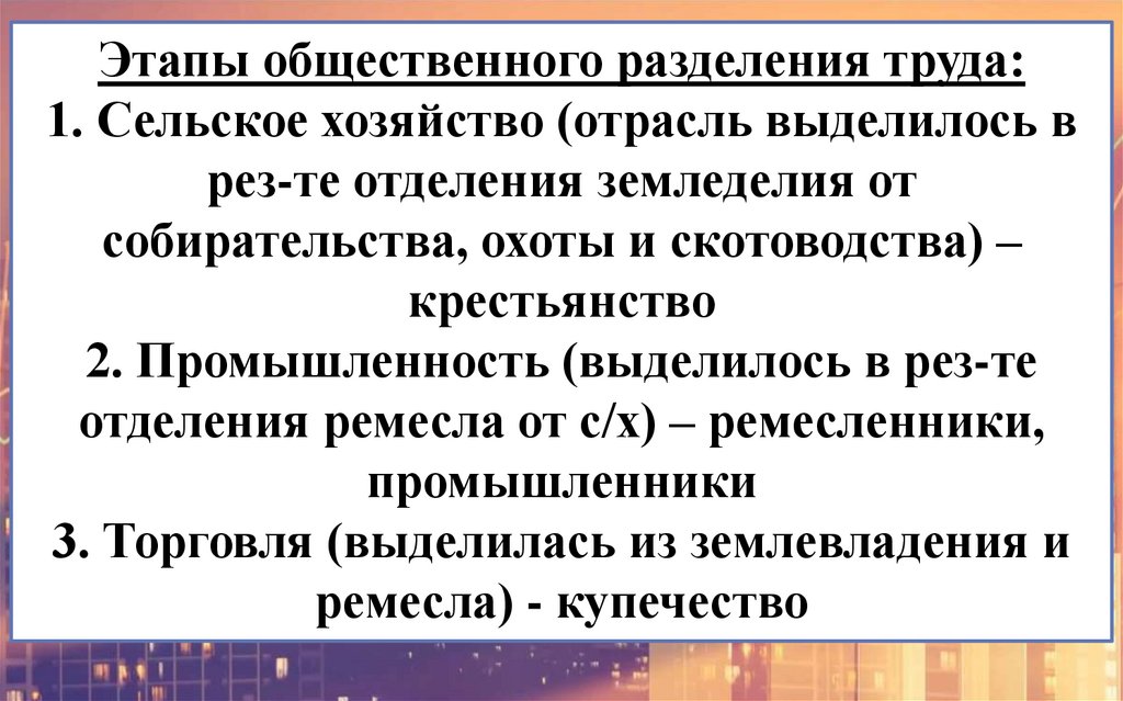 Этапы общественного разделения труда:1. Сельское хозяйство (отрасль выделилось в