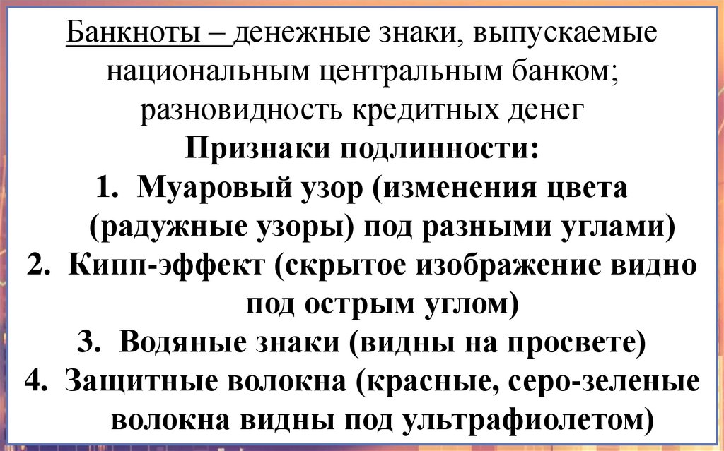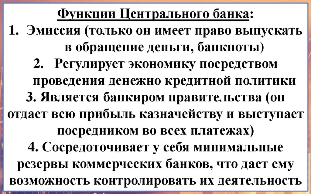 Функции Центрального банка:1. Эмиссия (только он имеет право выпускать