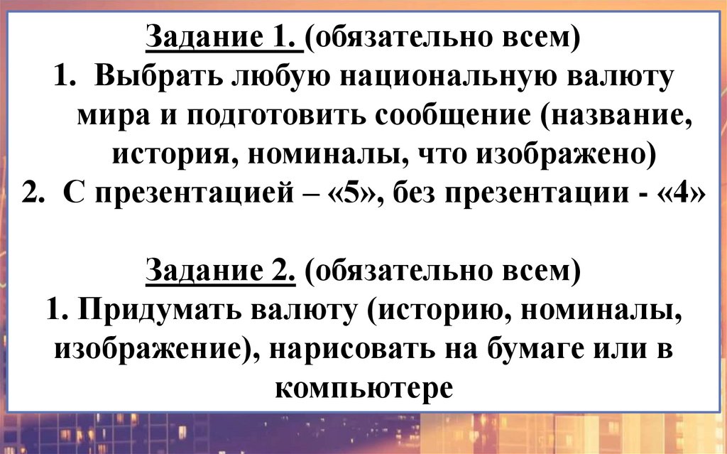 1. Придумать валюту (историю, номиналы,