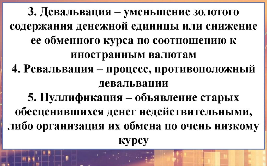 3. Девальвация – уменьшение золотогосодержания денежной единицы или снижение