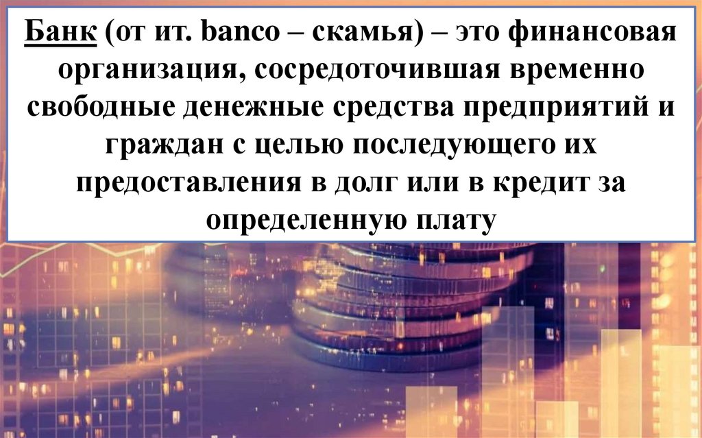 Банк (от ит. banco – скамья) – это финансоваяорганизация, сосредоточившая временно