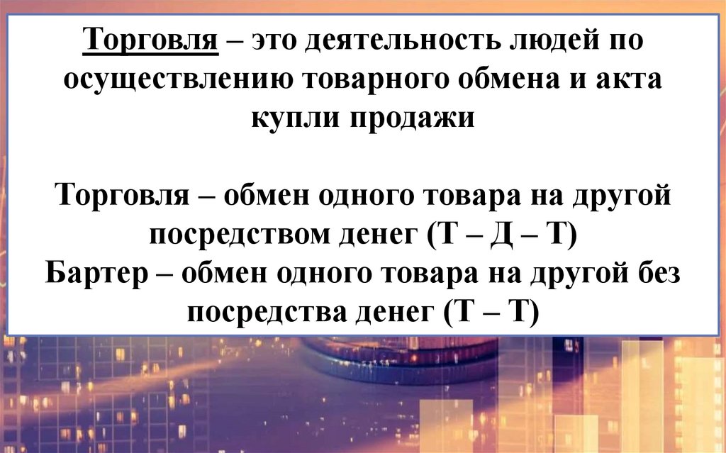 Торговля – это деятельность людей поосуществлению товарного обмена и акта
