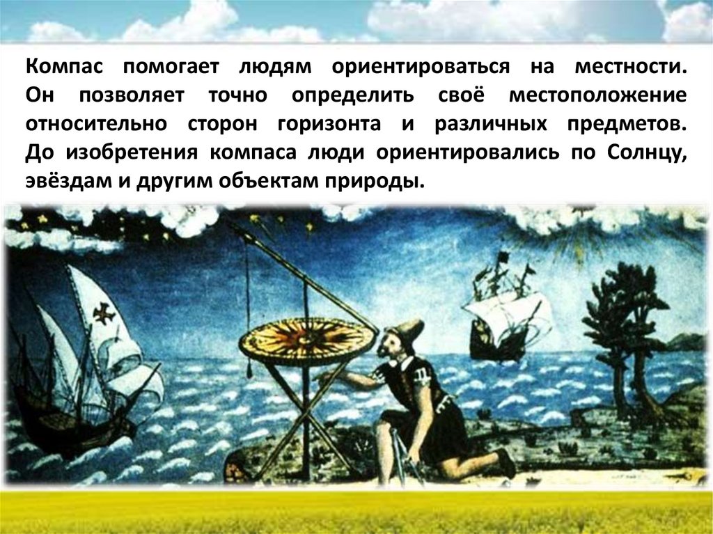 Компас помогает людям ориентироваться на местности.Он позволяет точно определить своё местоположение