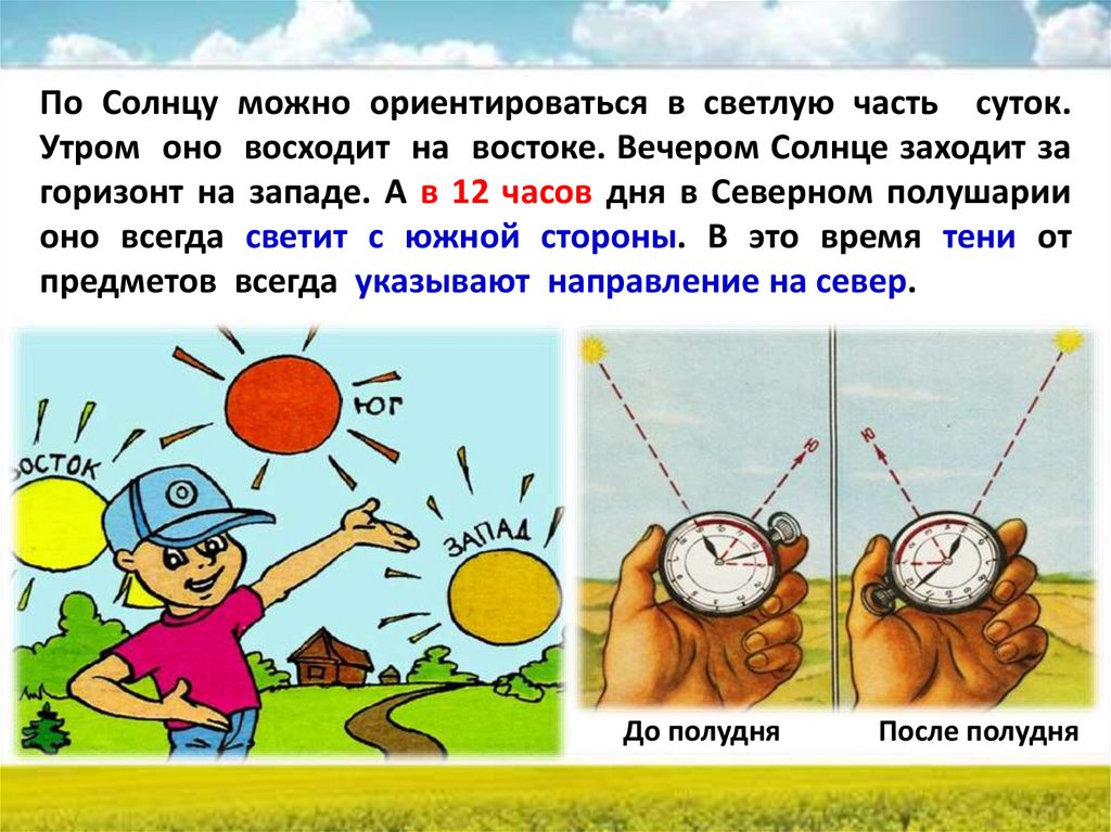 По Солнцу можно ориентироваться в светлую часть суток.Утром оно восходит на востоке. Вечером Солнце заходит за