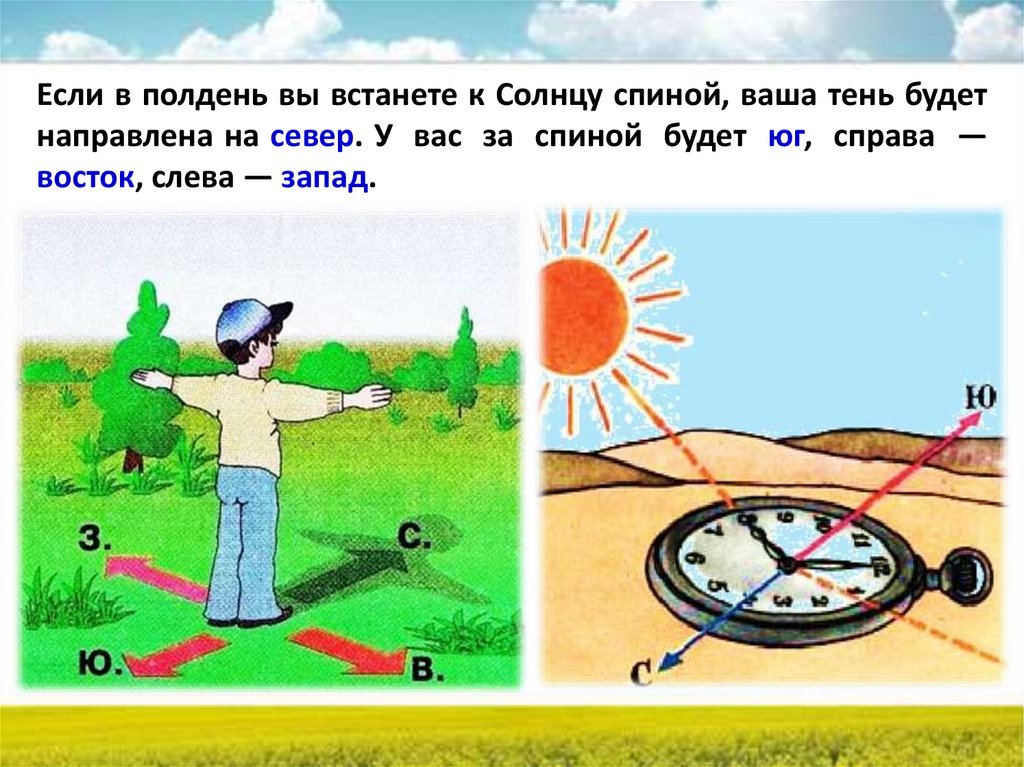 Если в полдень вы встанете к Солнцу спиной, ваша тень будетнаправлена на север. У вас за спиной будет юг, справа —