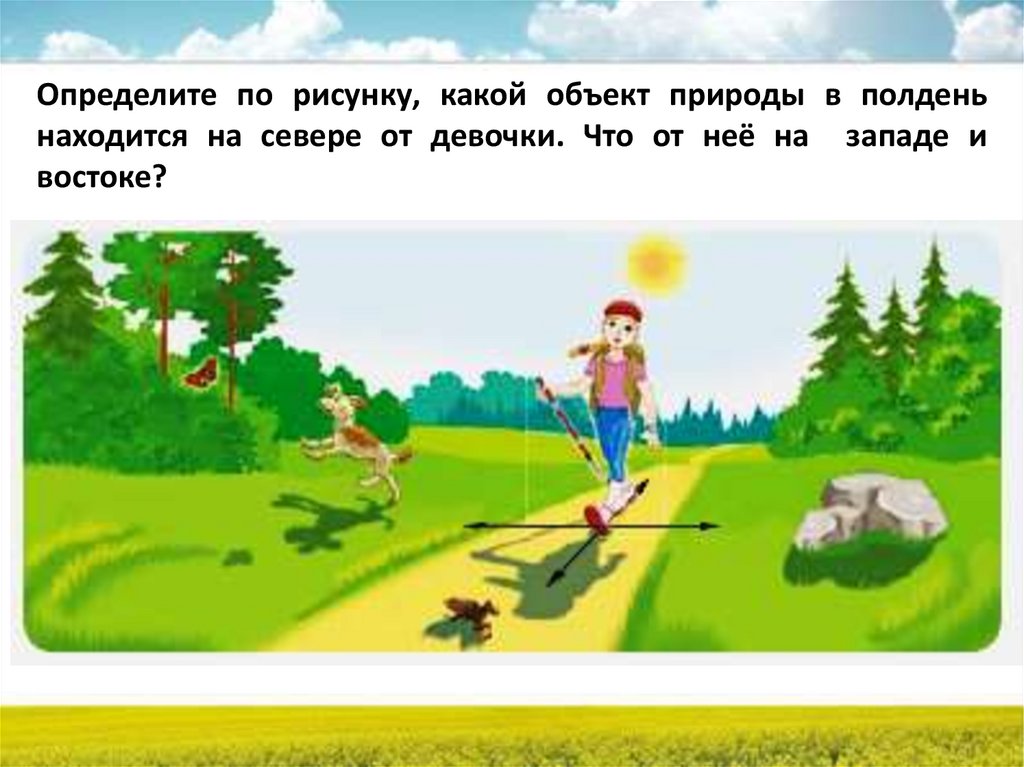 Определите по рисунку, какой объект природы в полденьнаходится на севере от девочки. Что от неё на западе и
