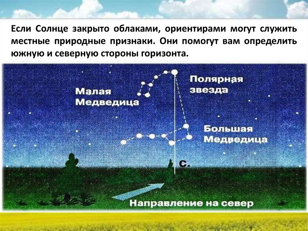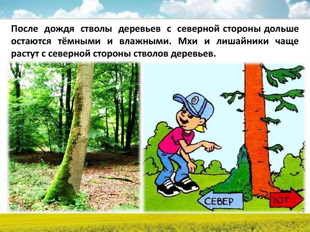 Если Солнце закрыто облаками, ориентирами могут служитьместные природные признаки. Они помогут вам определить