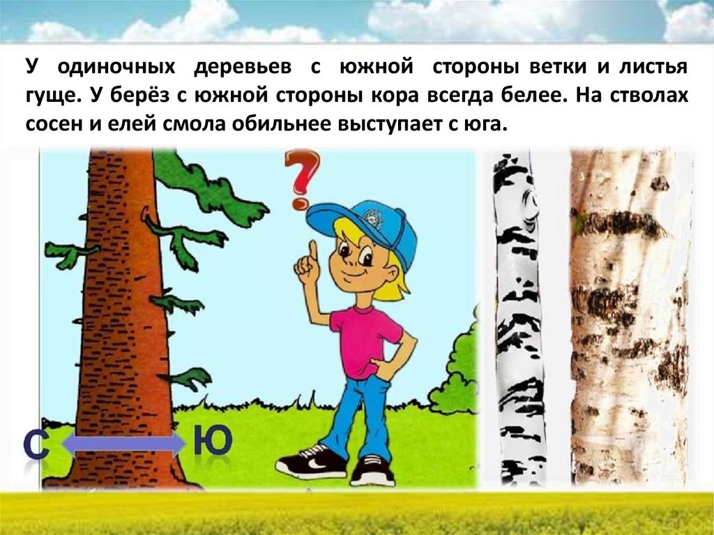 У одиночных деревьев с южной стороны ветки и листьягуще. У берёз с южной стороны кора всегда белее. На стволах