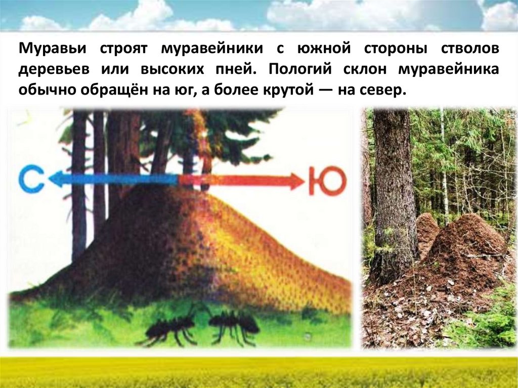 Муравьи строят муравейники с южной стороны стволовдеревьев или высоких пней. Пологий склон муравейника