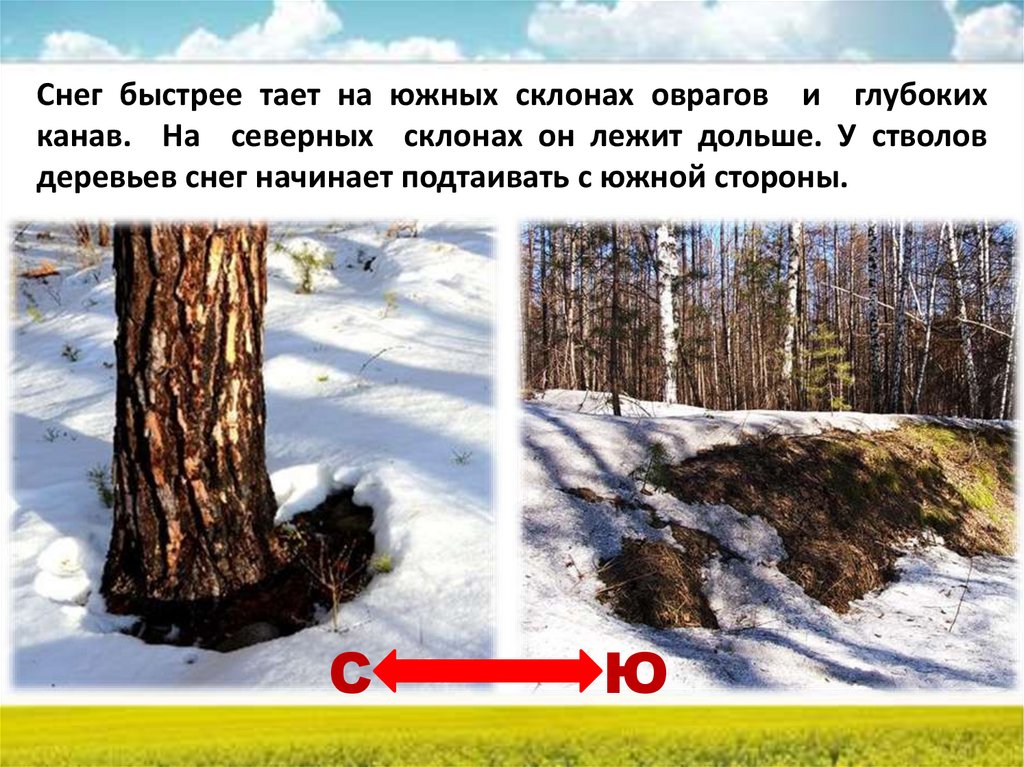 Снег быстрее тает на южных склонах оврагов и глубокихканав. На северных склонах он лежит дольше. У стволов