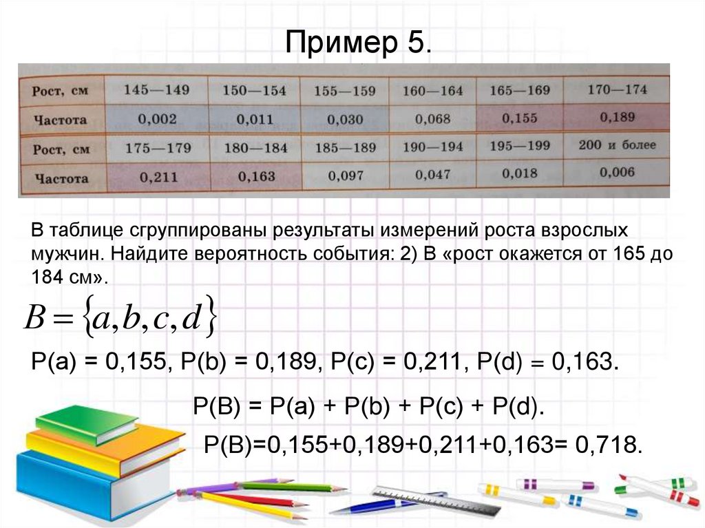 Р(В)=0,155+0,189+0,211+0,163= 0,718.