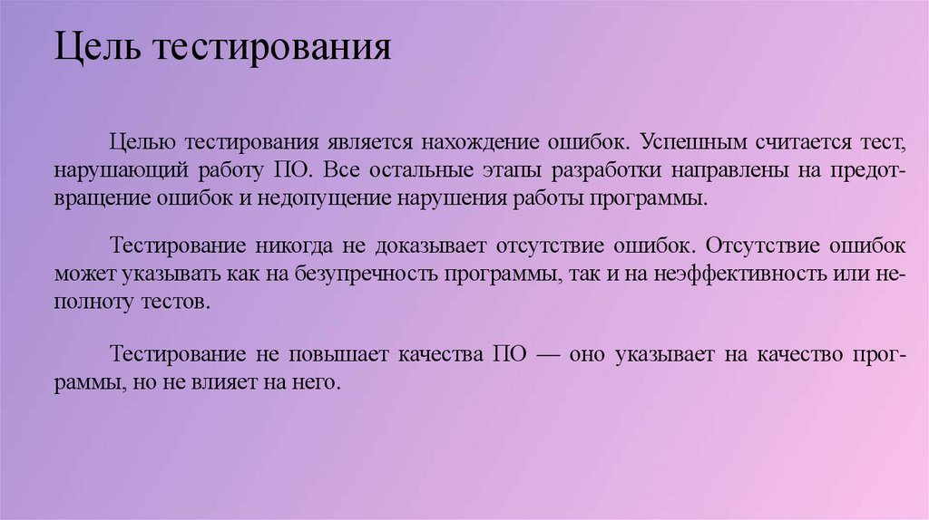 Цель тестированияЦелью тестирования является нахождение ошибок. Успешным считается тест,