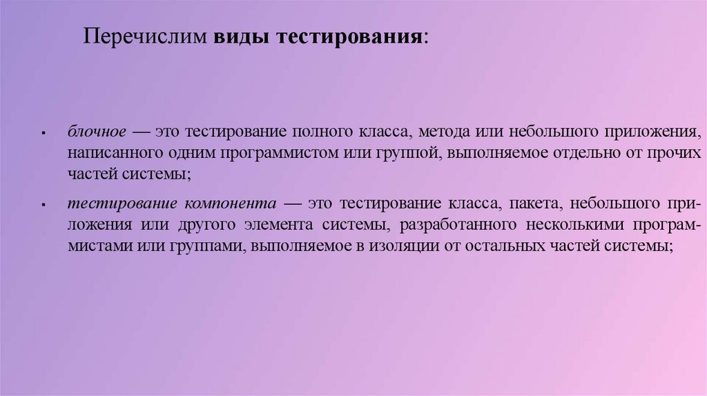 Перечислим виды тестирования:блочное — это тестирование полного класса, метода или небольшого приложения,